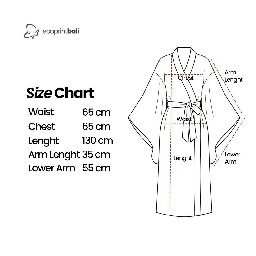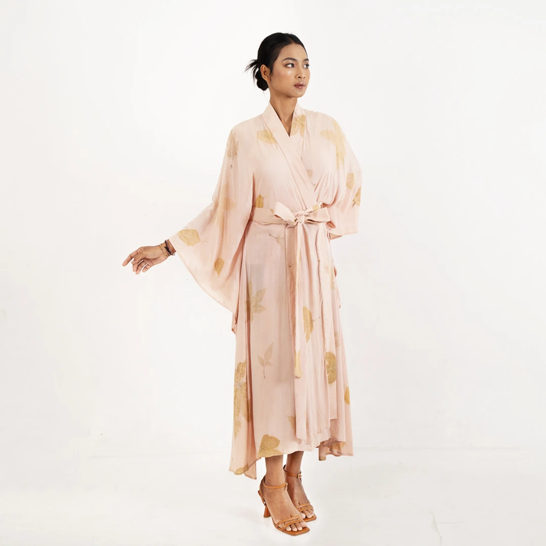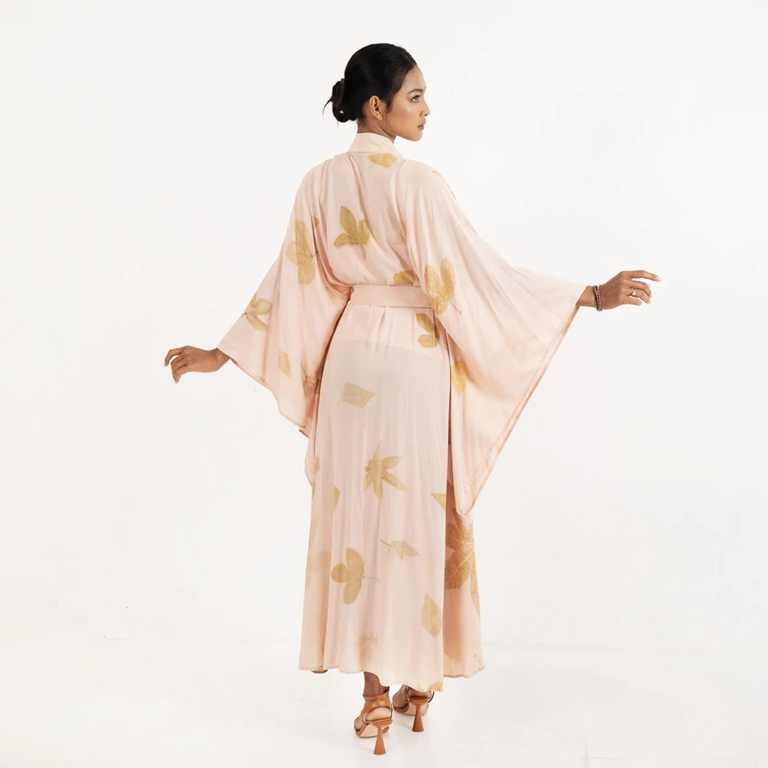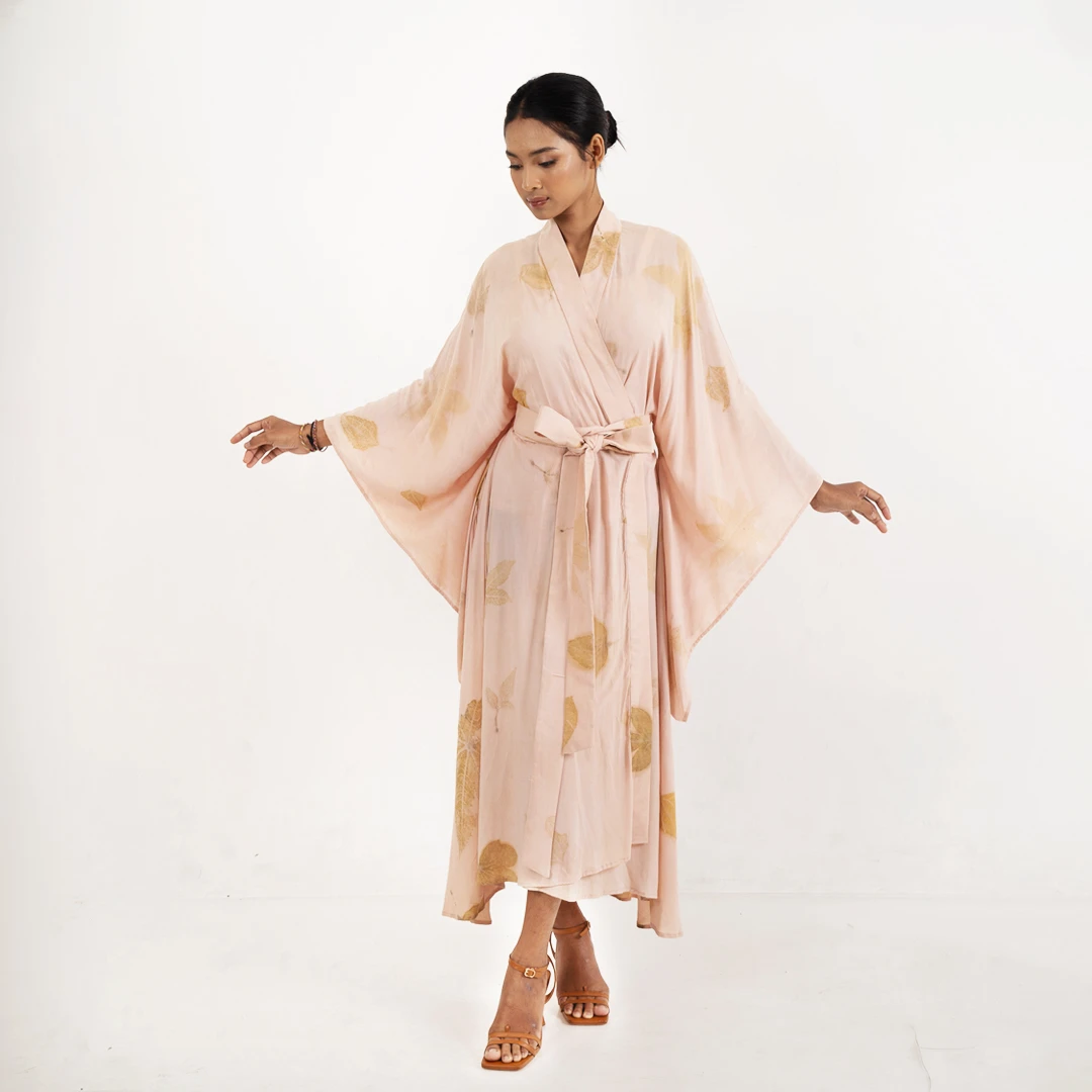 A long kimono with a natural leaf motif using a unique ecoprint technique on each piece. The flowy silhouette and soft colors create an elegant, light, and feminine impression.