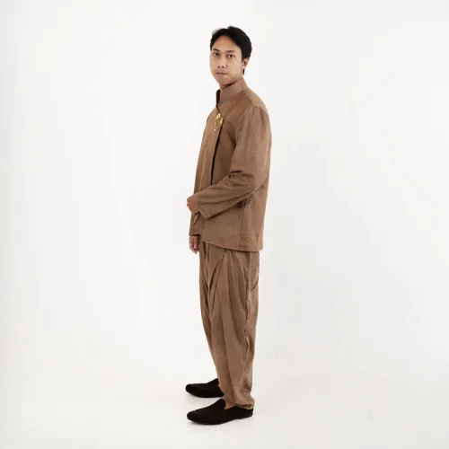 This modern black beskap set with ecoprint details on the inside of the lapel offers an elegant blend of classic and contemporary. Designed as a top and bottom set for a unique and distinctive formal look.