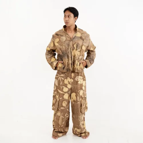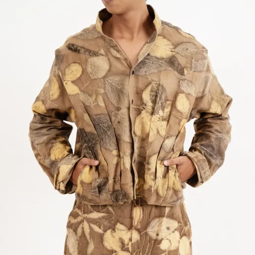 A unisex vest with earthy natural dyes that features a modern asymmetrical cut. It features an ecoprint accent panel as a statement detail, creating a minimal yet artistic look.